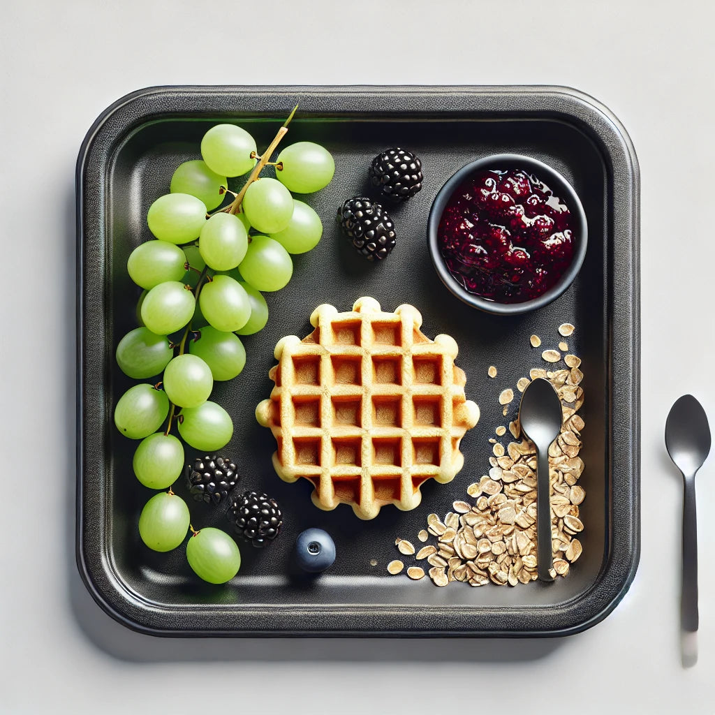 Waffles de avena acompañado de mermelada de zarzamora y uvas verdes.