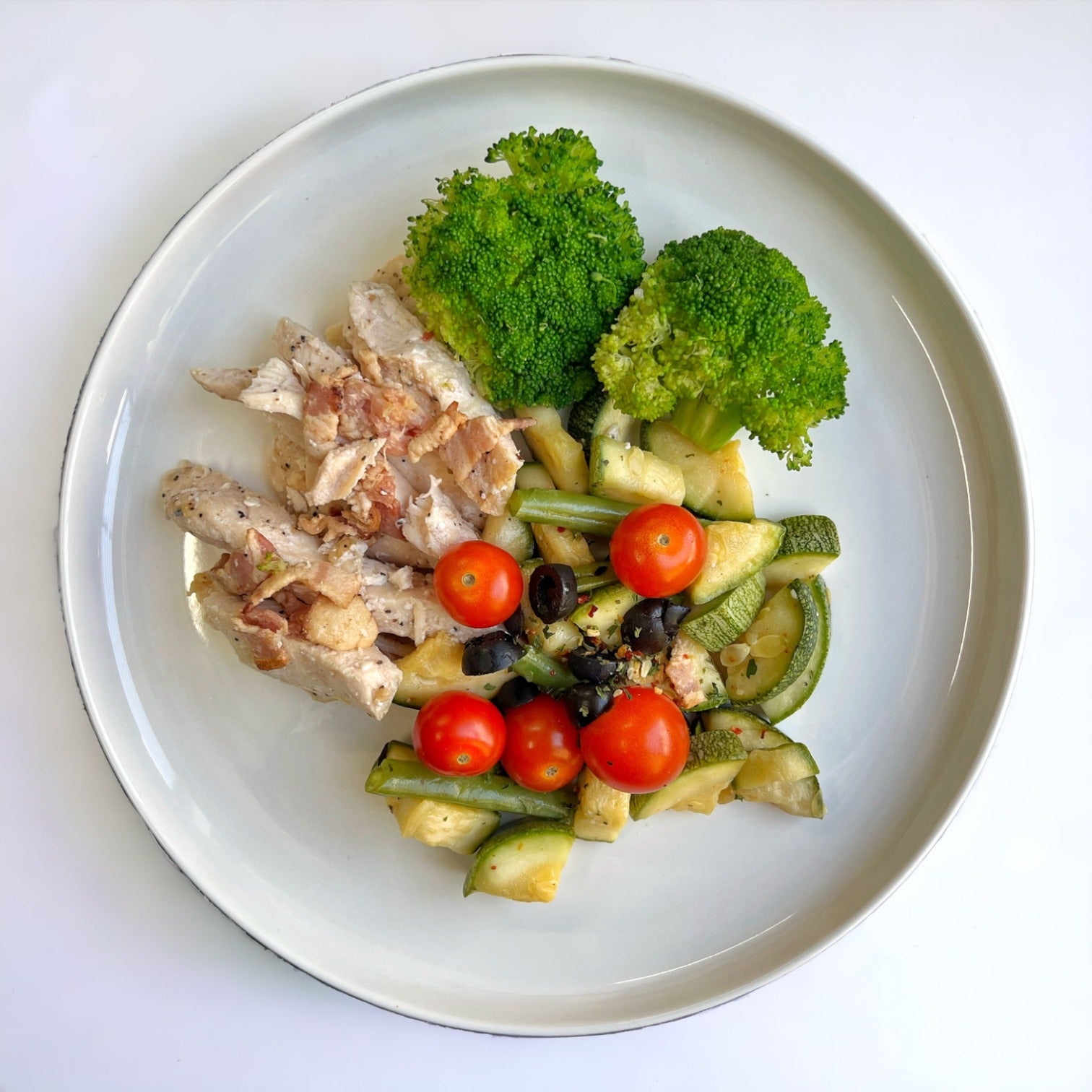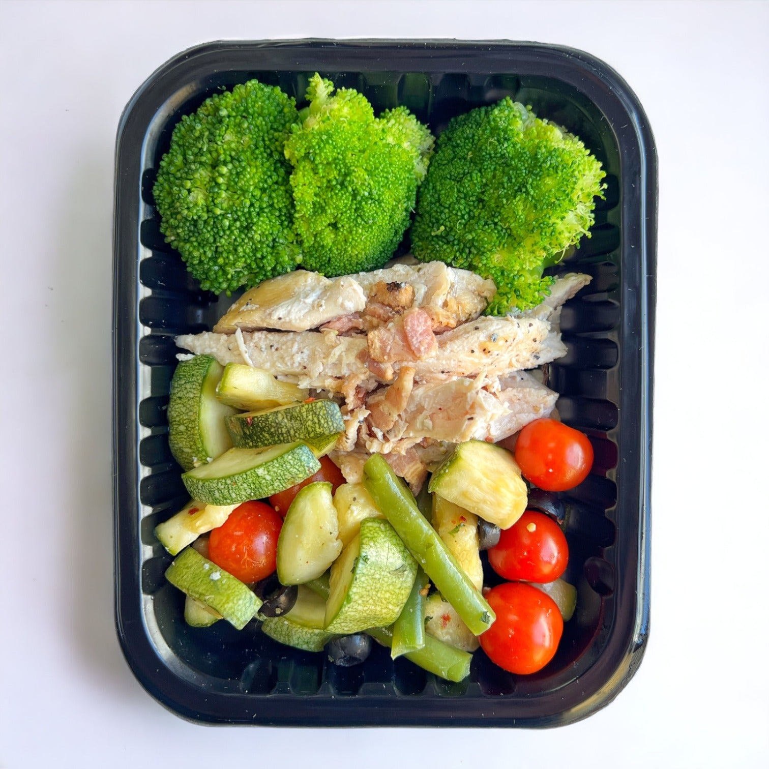 Experimenta la indulgencia en cada bocado de nuestro Bacon Butter Chicken. Pechuga de pollo sazonada con toque de naranja y pimiento verde, acompañada de ejotes, tocino y brócoli.