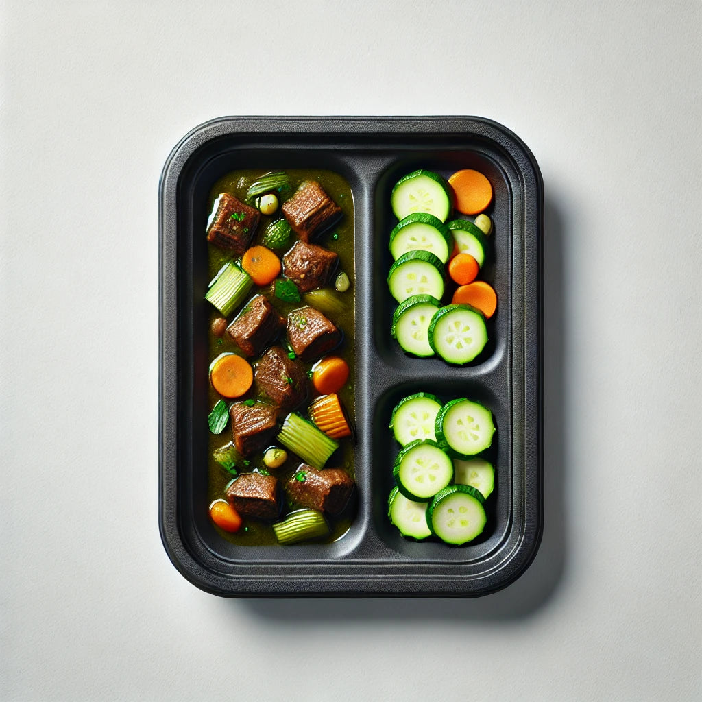 Cortadillo de res con chayote y zanahoria acompañado de cubos de calabaza.