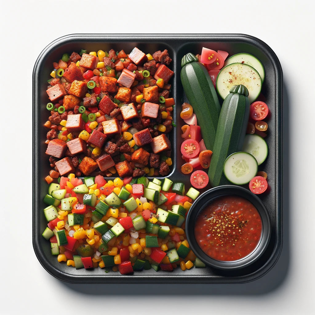 Discada mixta con pechuga de pollo, carne de res, salchicha, vegetales acompañada de calabaza y salsa morita.