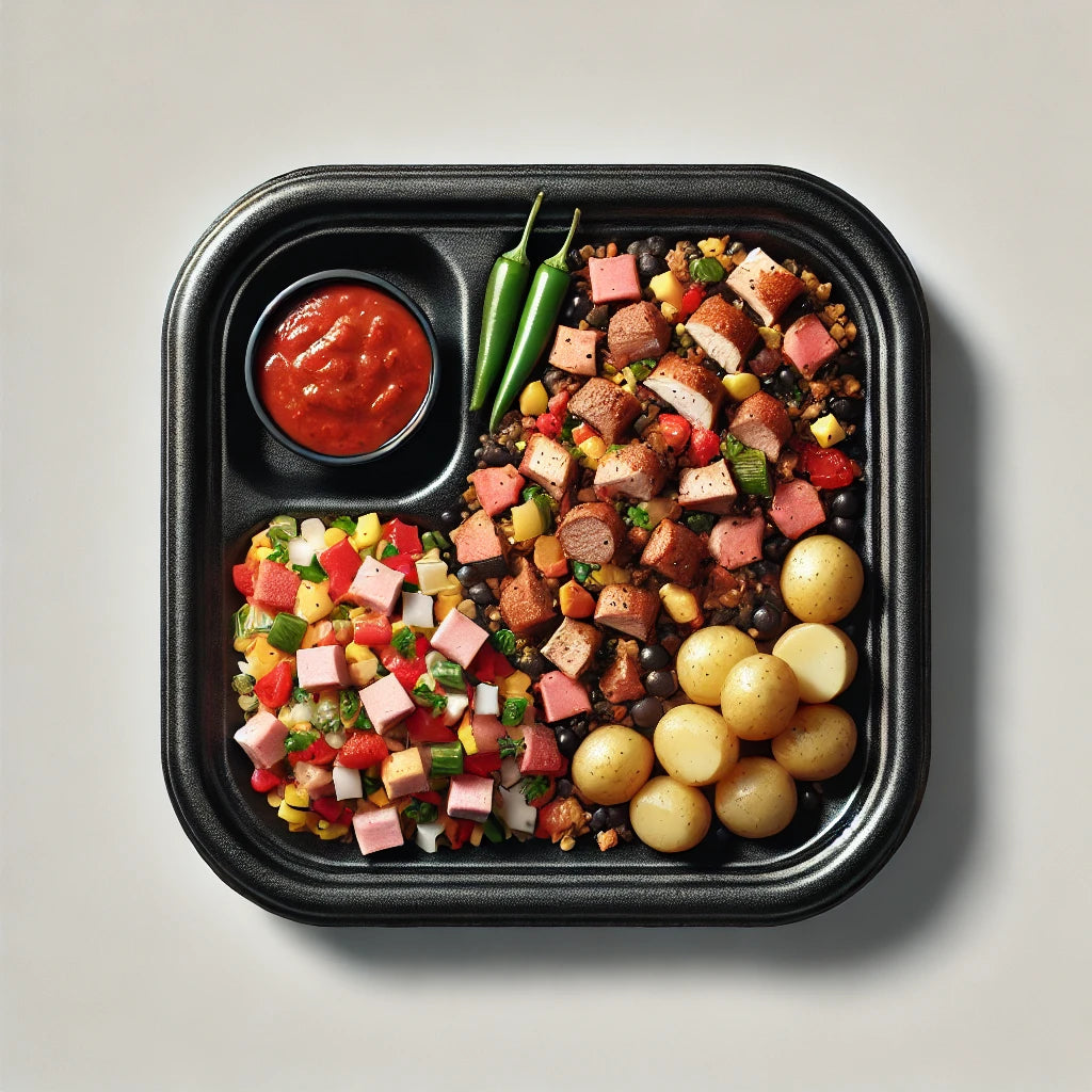 Discada mixta pechuga de pollo, carne de res, salchicha, vegetales acompañada de papita cambray y salsa morita