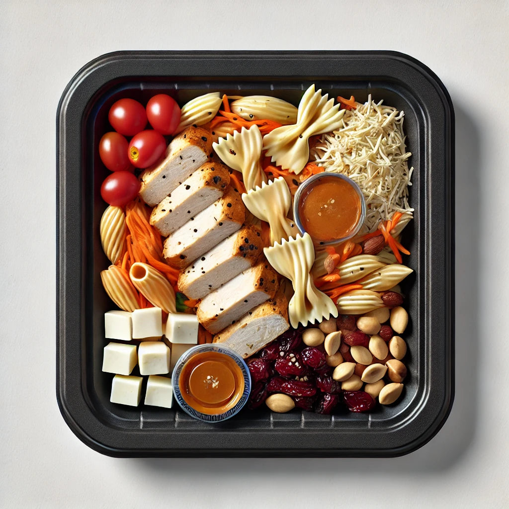 Ensalada de pasta con pollo queso panela, tomate cherry, cacahuates, arándanos, zanahoria y aderezo chipotle