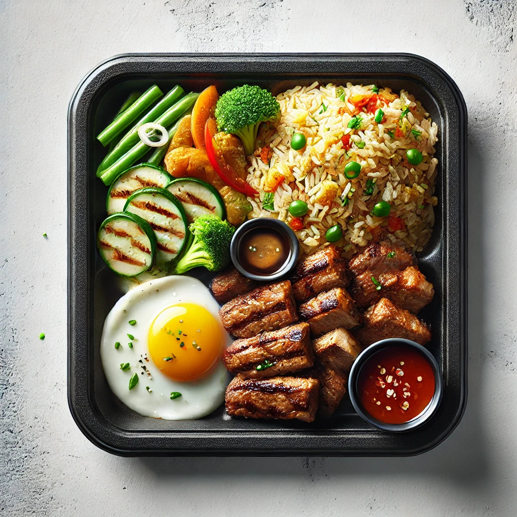 Fajitas de pollo y res acompañado de arroz frito con vegetales y huevo, salsa de soya y salsa siracha