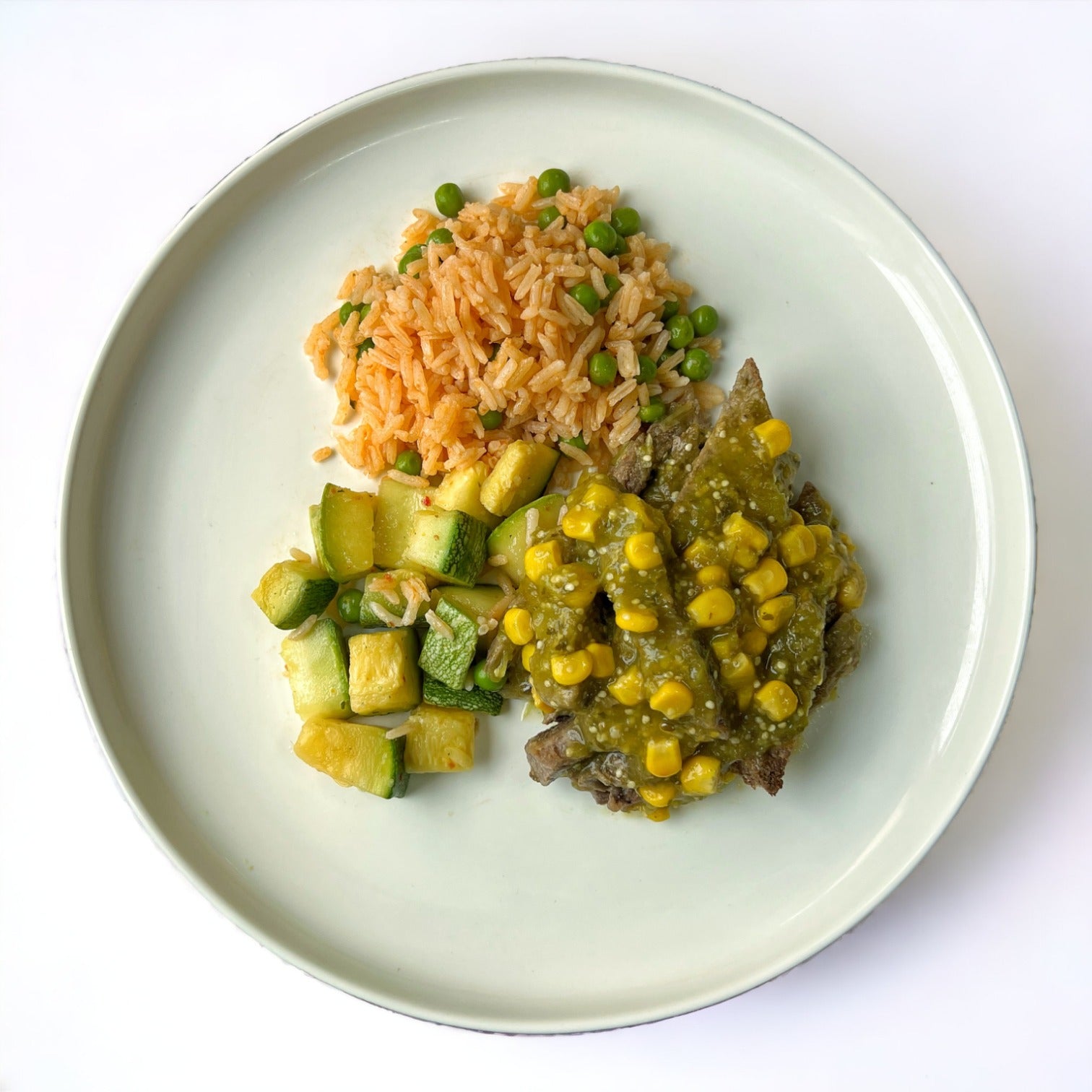 Sumérgete en la esencia de México con nuestras Fajitas de Res en Salsa Verde. Sirloin sazonado a la perfección, acompañado de calabaza, elote dorado y arroz con sazón.