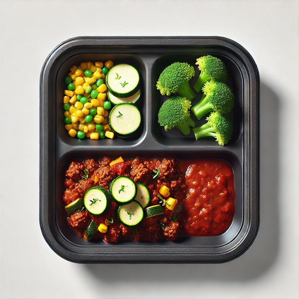 Guisado de carne molida con calabacitas y elote acompañado de brócoli al vapor y salsa de tomate chipotle.