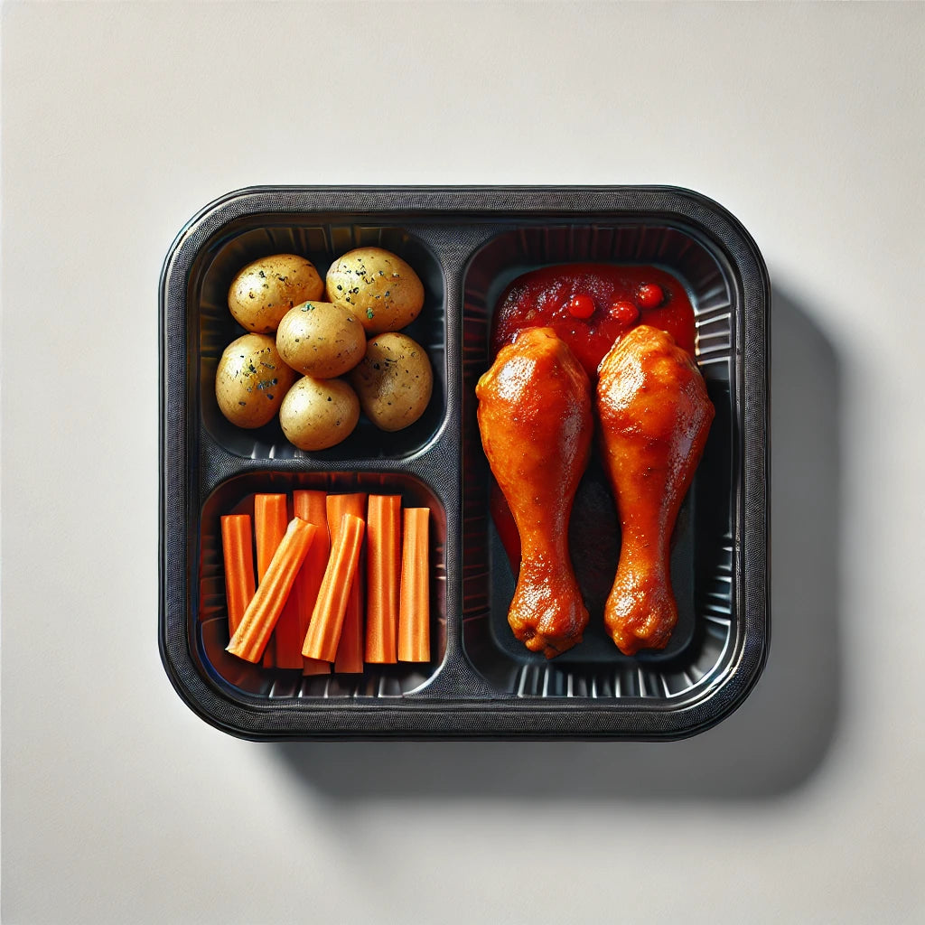 Muslos en salsa de tomate acompañado de papita cambray y zanahorias fileteadas.