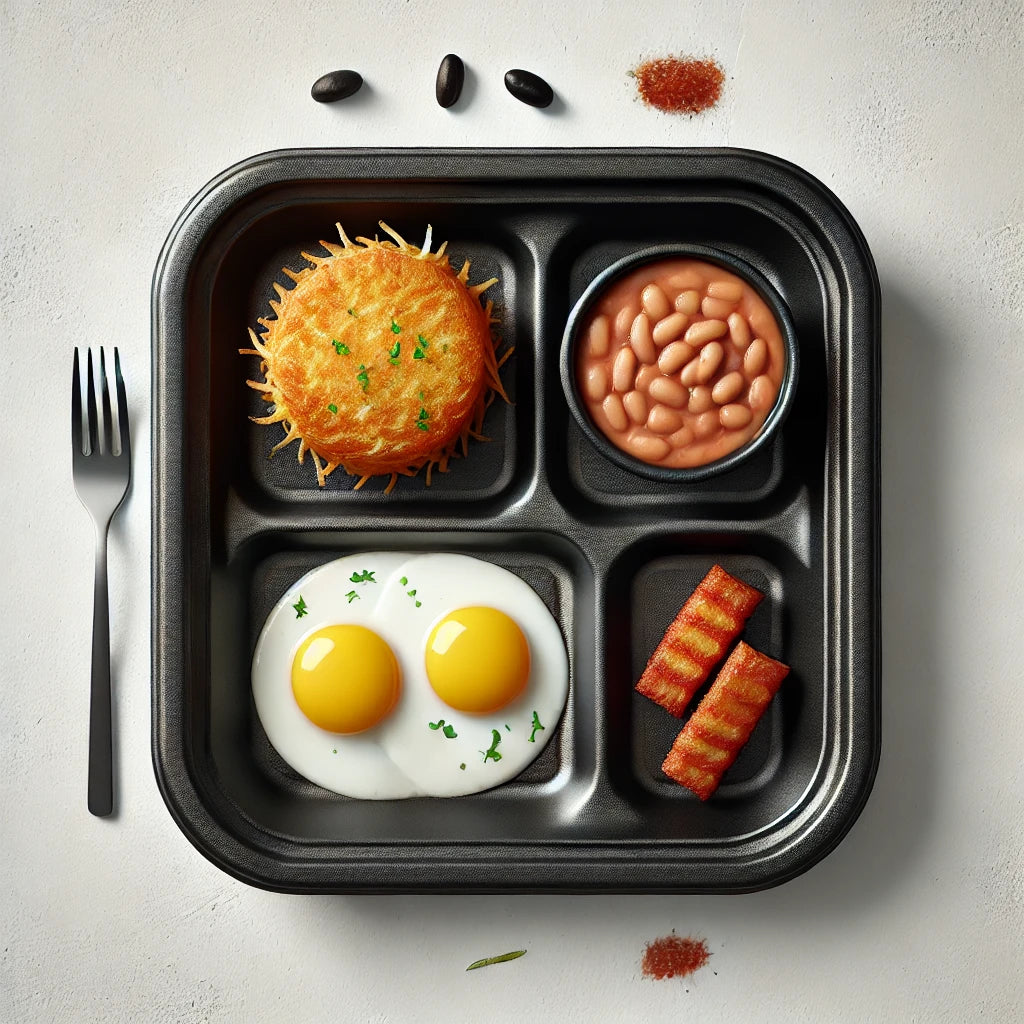 Nido de papa hash Brown con huevo estrellado Acompañado de frijoles refritos y chorizo, salsa picante