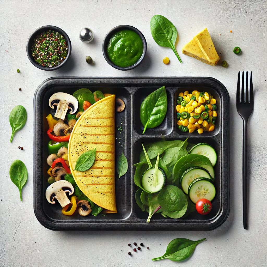 Omelette relleno de champiñones y fajitas de pimientos acompañado de cubos de calabaza, elote, espinaca y salsa verde.