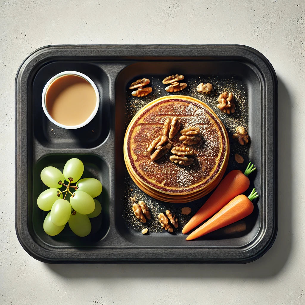 Pancakes de zanahoria, canela y nuez acompañado de cremoso dulce y uvas verdes.