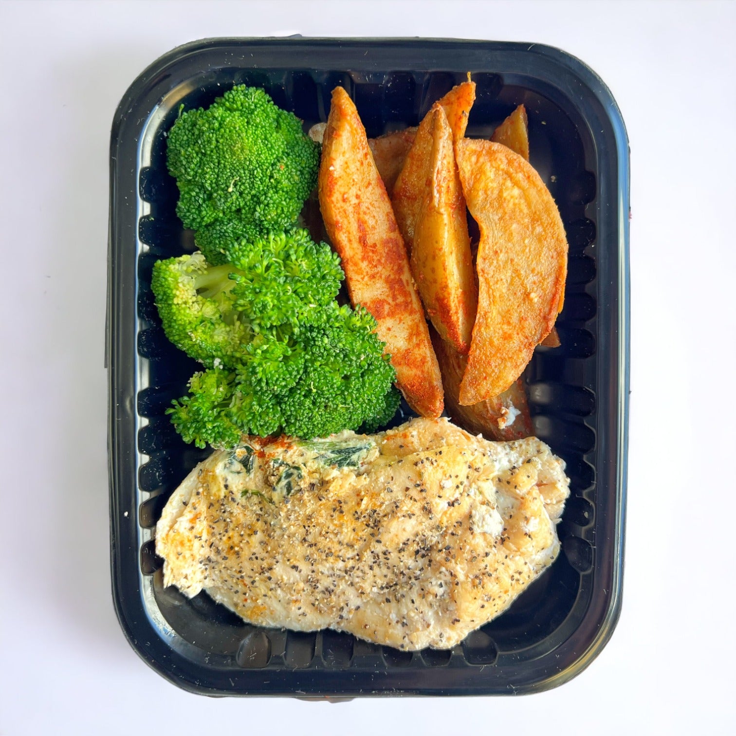 Disfruta de una explosión de sabor con nuestra Pechuga de Pollo Rellena de Queso Crema. Rellena de espinacas y queso crema, acompañada de gajos de papa y un dip cremoso de cebolla.