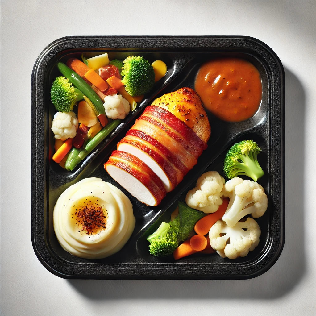 Pechuga de pollo rellena de cheddar y jamón envuelta en tocino acompañada de puré de papa, vegetales mixtos y crema chipotle