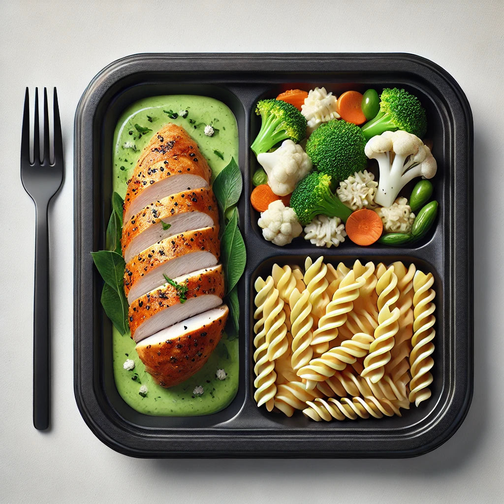 Pechuga de pollo rellena de queso crema acompañado de pasta fusilli con crema de pimientos y vegetales mixtos