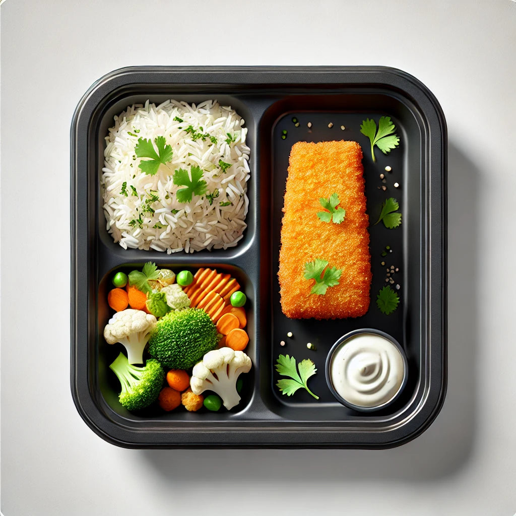 Pescado empanizado acompañado de arroz al cilantro, vegetales mixtos y salsa tártara