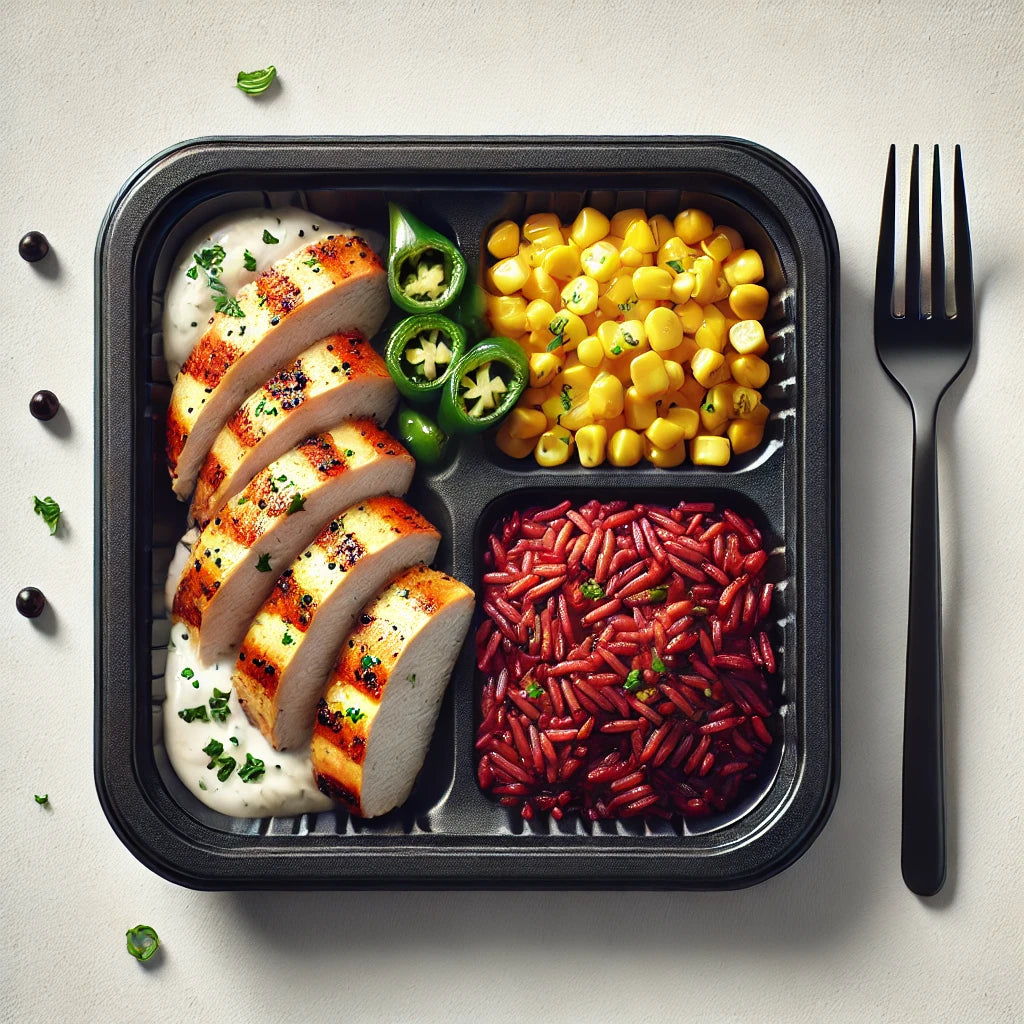Pechuga de pollo con rajas poblanas cremosa y elote acompañado de arroz rojo