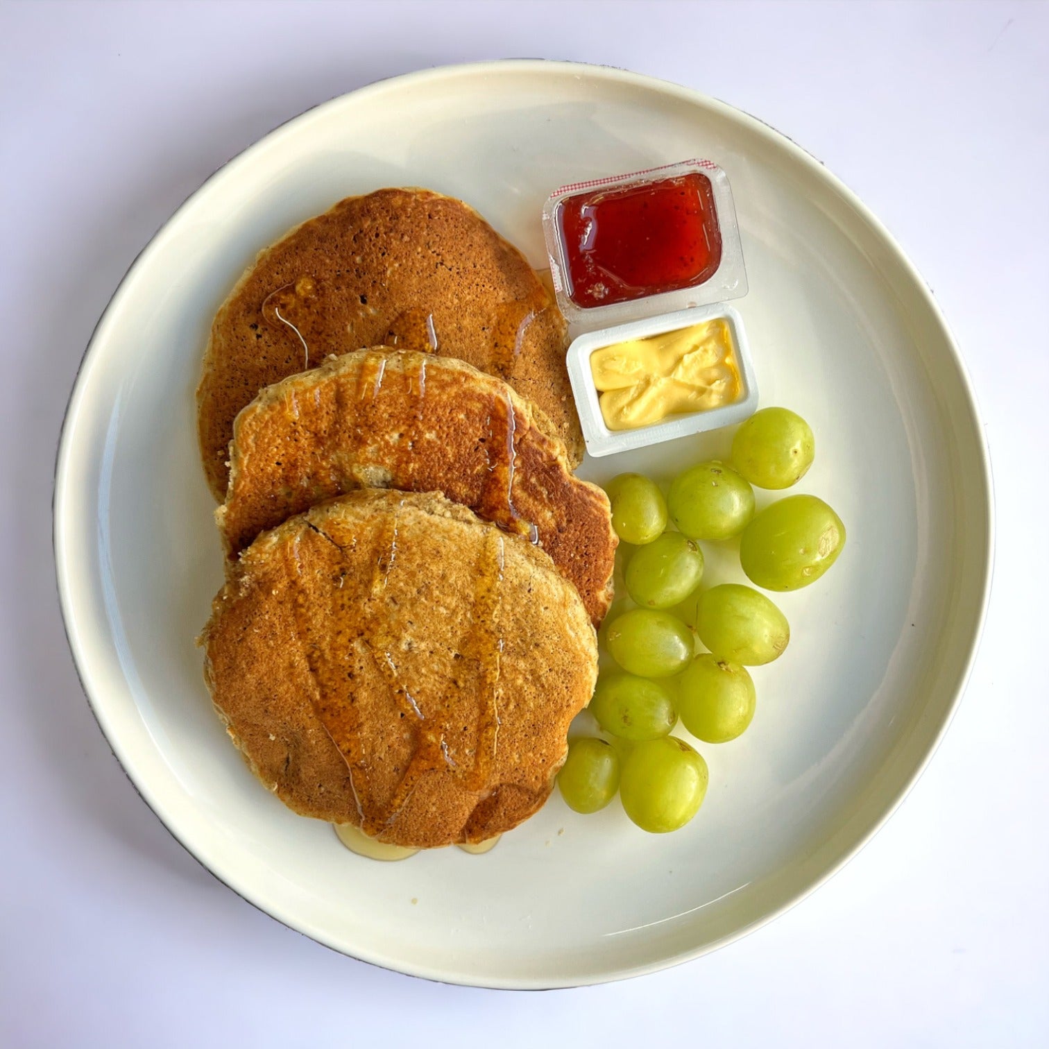 Deléitate con nuestros Pancakes de Nuez, una combinación perfecta de harina de avena y nueces crujientes. Acompañados de mermelada de fresa y uvas frescas, son la opción ideal para un desayuno completo.